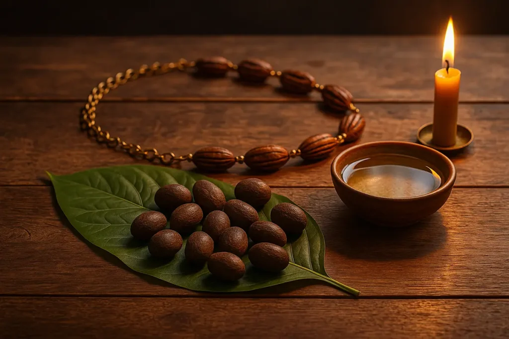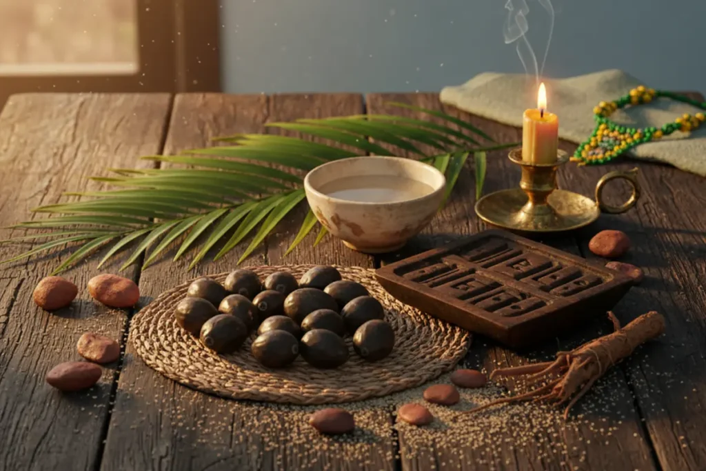 - El ikin: dieciséis nueces sagradas de palma (awá) que representan la presencia viva de Orula. Con ellas se consultan los odù y se establecen diálogos espirituales profundos.